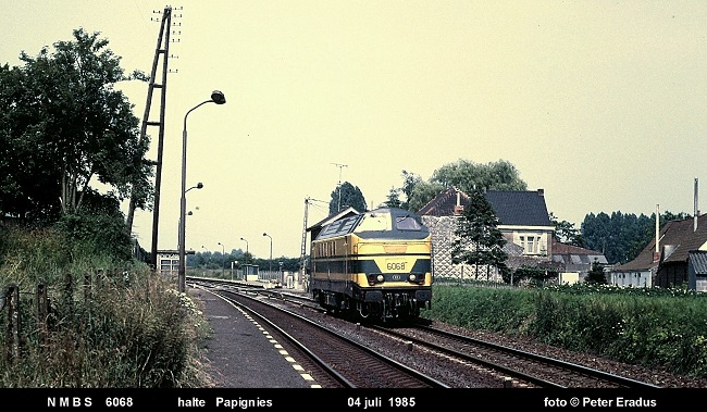 Halte Papignies ligt tussen Aat en Geraardsbergen en dit traject werd in 1988 voorzien van bovenleiding, dus ik was toen nog net op tijd om de oude sfeer op de dia vast te leggen.