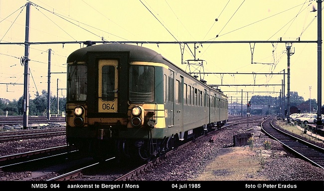 Met hun grote en wat gebogen voorruiten vond ik dit altijd wel fraaie treinstellen. Op 4 juli 1985 komt treinstel 064 (bouwjaar 1954) aan mijn camera voorbij op het stationsemplacement van Bergen / Mons.