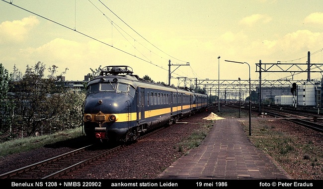 In 1986 nog een compleet normaal beeld. De Benelux onderweg van Amsterdam naar Brussel rijdt het station van Leiden binnen voor een korte stop.