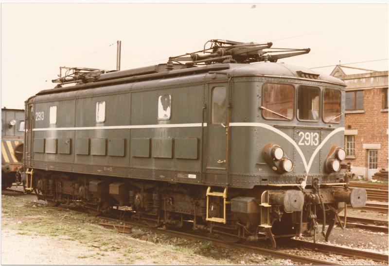 En hier een foto van toen loc 2913 nog als "momument" opgesteld stond in de CW Mechelen. Op de achtergrond zien we de verhoogde spoorbedding van het station Mechelen met een Benelux op spoor 10. Mechelen, 24 juli 1989.