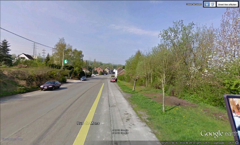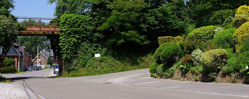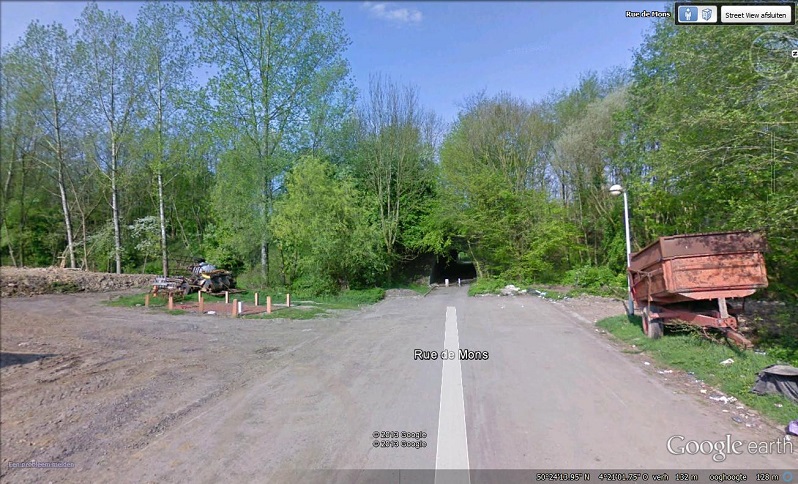 In deze serie mag er ook wel eens een weinig afgeweken worden van "dit Topic" (is dit in het Vlaams wel een uitdrukking?) . Als er een Metro Leger wordt aangelegd zullen er dus ook routes en rails verdwijnen. In Fontaine Leveque zien we hier een mooi voorbeeld van. Ter plaatse veranderde de Rue de Mons van een drukke doorgaande weg in een slaperig "boeren landbouw weggetje", hoewel qua geluid er weinig van slapen terecht zal komen: het tunneltje aan het eind is een voetgangers/ fietsers onderdoorgang van het klaverblad in de N9 die-vierbaans- op ongeveer 50 meter rechts van de foto op volle kracht raast richting Anderlues, en geluidschermen zijn in Wallonië nog nooit vertoond.! De volgende ongeveer 1 Kilometer is volledig afgebroken, en de vooruitgang heeft alles hier onherkenbaar veranderd. Ook is dit een mooi voorbeeld van vertekening in perspectief: je zou zweren dat de plaats waar de vangrail zich verwijdt ook de voormalige wisselplaats is- maar nee dus! Pas 300 meter verder correspondeert de omgeving en de huizen exact met de oude foto...