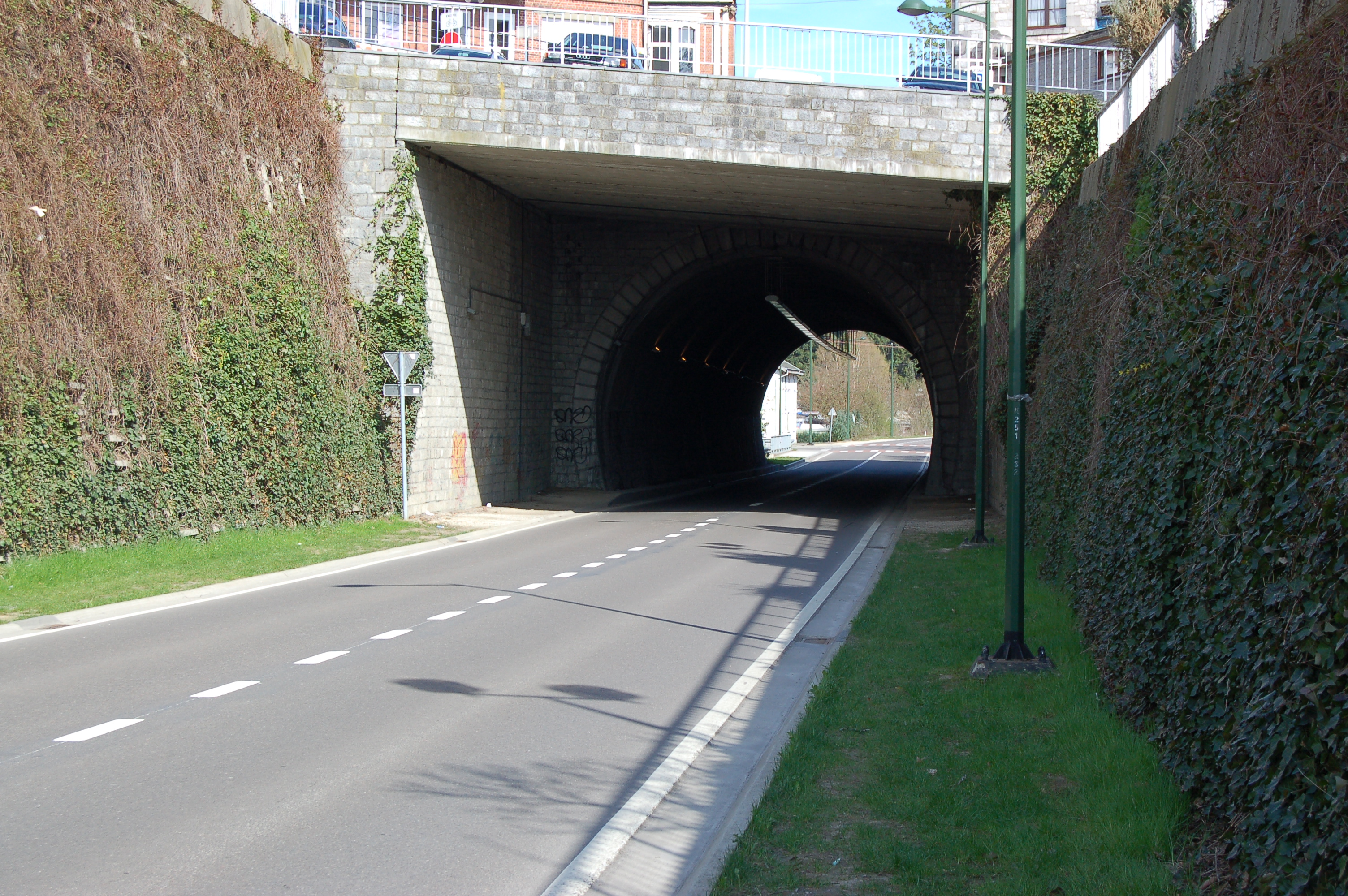 Ik heb zelf ook nog even verder gezocht en ben zo op deze site terecht gekomen met een foto uit 2011, daar spreekt men ook van het fietspad dat deze tunnel niet aandoet. Mijn gedacht is dus dat ze tussen de 2 bruggen over de Lesse moet liggen, maar Google Earth kan geen duidelijkheid brengen.
