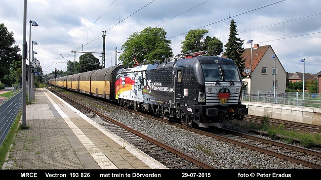 Op woensdag 29 juli 2015 kwam de op 28 juni 2015 in dienst gestelde Vectron 193 202 aan mijn camera voorbij te Döverden, een halte langs de spoorlijn Bremen<>Hannover. Met veel geluk is het zelfs een zonnige opname geworden, tussen de vele (onweers-)buien met harde stormachtige wind door.