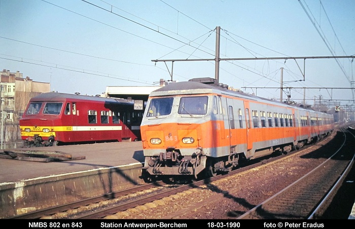 In begin '90 jaren werden de treinstellen MS75 omgeschilderd van het grijs/oranje naar het rode kleurstelling treffend weergeven op deze foto te Antwerpen-Berchem.