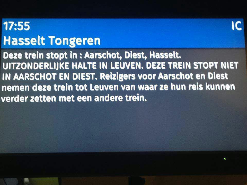 ronny schreef:Vanavond vertragingen en afschaffingen tussen Leuven en Aarschot. Volgens de tbg tgv het wegslepen van de 2 bakken. Hoelang dit ging duren was niet bekend. Uiteindelijk heb ik een uur in de trein zitten wachten (van 16u58 tot 17u58) . Nadien vertrok de trein om voor het volgend sein nog eens 20 minuten stil te staan. Dit heeft me een persoonlijk record wat minuten vertraging opgeleverd. In volle avondspits dit uitvoeren, :?: