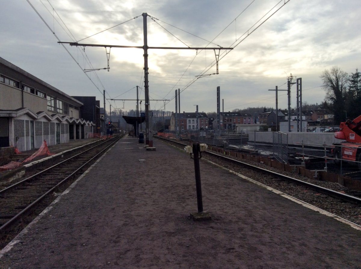 Onderstaand twee foto's van de huidige situatie in Ciney. Het nieuwe perron krijgt aardig vorm, en op de eerste foto is ook te zien dat het huidige perron door een nieuw perron zal worden vervangen. Uiteindelijk krijgt Ciney dus twee perrons.