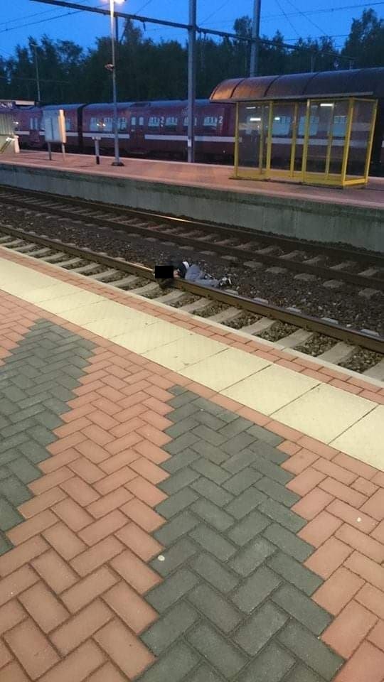 Ik had de vroege dienst en kom altijd met de fiets werken. Het fietslokaal bevindt zich aan het perron en toen ik hier naartoe wandelde zag ik plots iemand in het spoor liggen. Ik riep iets in de trend van "maak dat ge dat spoor uit zijt idioot" en kreeg als antwoord "laat me slapen godverdomme". Ik heb dan maar met mijn dienst-gsm de seingever gebeld om het verkeer stil te laten leggen en hierna ook de politie verwittigd. Alarm verzenden zonder GSM-R en het juiste alarm nummer van buiten te kennen ging nogal moeilijk. Tijdens het wachten op extra hulp bleef de dronkaard lekker verder slapen. Uiteindelijk heeft een collega treinbegeleider die iets later aankwam hem kunnen overtuigen om uit het spoor te klimmen en iets later heeft de politie hem dan meegenomen.