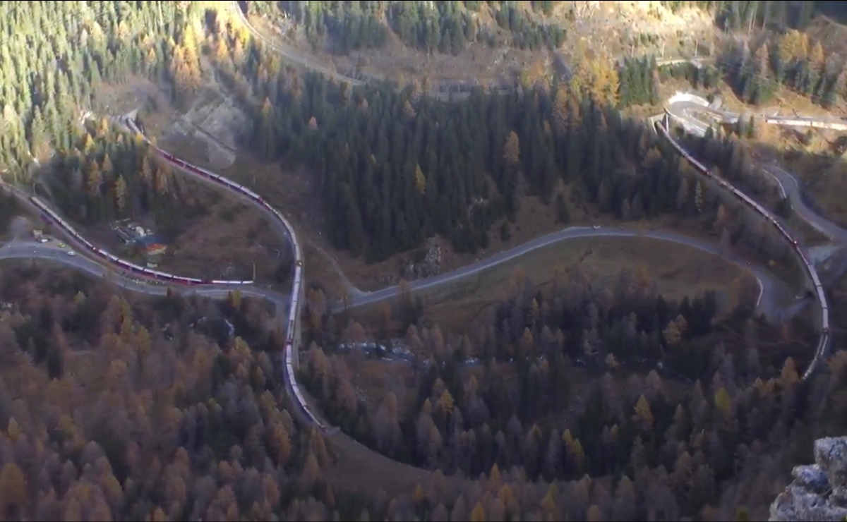 Als je wil weten hoe een trein van 1910m zich door het landschap wringt. Bron: beelden van Blick TV.