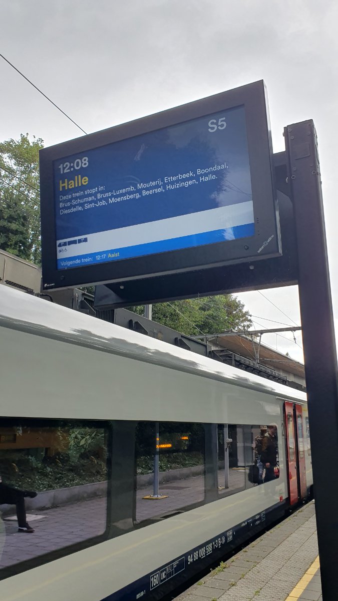 Ook in Jette te zien nu er weer treinen rijden. Lijkt goed te werken, aanduiding richting kan beter (nu moet je het afleiden uit het feit dat de trein aan slechts één kant een spitse neus heeft...) en je vraagt je vooral af waarom ze niet dezelfde afbeeldingen gebruiken als uit de app, waardoor je dus ook het type trein ziet. Ik veronderstel toch dat die schermen alle kleuren kunnen tonen?