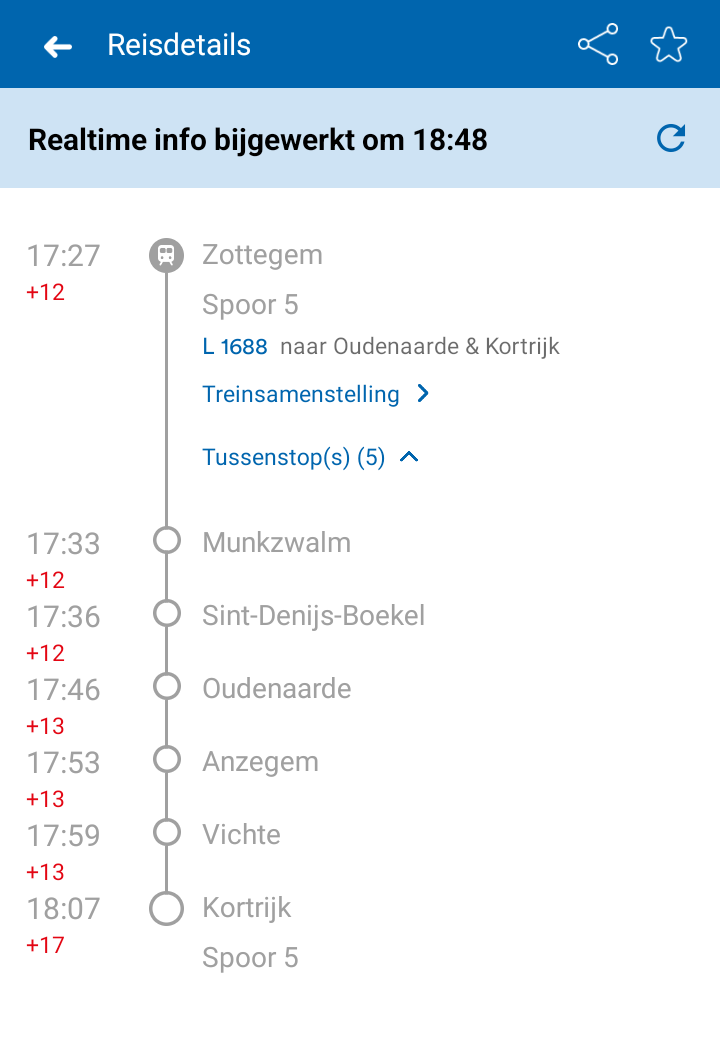 Dan verwacht je dat iemand er manueel 12 minuten heeft opgeplakt of automatisch werd overgebracht na vertraging van een vorige rit? In dat geval zal de vertraging naargelang het traject vordert dalen volgens de ideale omstandigheden die worden berekend, is mijn ervaring. Nu stijgt die echter naar 17 minuten in Kortrijk. Da's toch wel ongewoon. Heeft de trein misschien alsnog leeg gereden richting Kortrijk? Dan was de 'vertrek te bevestigen' die er stond misschien omdat er gehoopt werd nog vervangmaterieel te vinden.