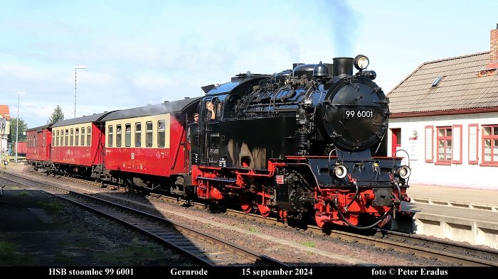 In de allerlaatste dagen van haar actieve inzet op de HSB lijnen komt locomotief 99 6001 met trein het station van Gernrode binnenrijden.