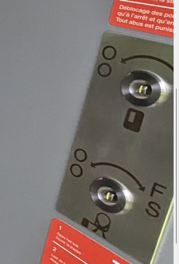 Deze deur heeft ook twee "OFS schakelaars" om de deur te openen wanneer deze door het automatische systeem als "onveilig dus niet ontgrendeld" wordt beschouwd. Een om de deur te openen en te sluiten en een tweede voor god weet welke functie, er staat een tekeningetje bij die schakelaar maar die kan ik niet ontcijferen (het lijkt wel op een persoon met een vlag misschien?) en onze handleidingen van het materieel ontbreken nog steeds de M7BDUH rijtuigen helaas.