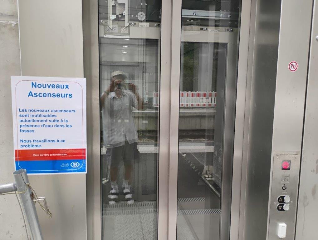 De reisplanner geeft verkeerde resultaten van Brussel-Luxemburg naar Beauraing. Op het uur '56 vertrekt een trein naar Namen waar je overstapt (9' overstaptijd). Het is me een raadsel waarom de reisplanner een trein vroeger ('38) opgeeft, bovendien een oncomfortabele desiro-IC. Bij deze desiro moet je niet overstappen in Namen maar in Dinant: nog zo'n onaangename ervaring. Je moet de sporen over via een nieuwe brug en de lift werkt niet vanwege water in de gracht. Green pretje om mijn fiets naar boven te sleuren en weer omlaag - al is volgens https://bikeontrain.belgiantrain.be het perron rechtsreeks toegankelijk zonder trappen. Met een zware elektrische fiets lijkt me dit haast onmogelijk, met een rolstoel zeker - ook al staat Dinant op de lijst van 'assistentie voor personen met beperkte mobiliteit'
