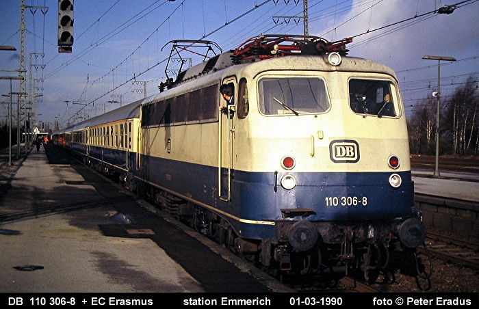 Een nog heel klassiek uitziende EuroCity "Erasmus" staat te wachten op vertrek te station Emmerich.