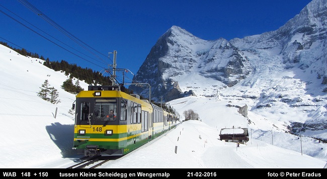 Op de foto het modernere materieel van de WAB, in een gebied alwaar de sneeuw nog wel redelijk hoog lag. Kleine Scheidegg ligt op ongeveer 2060 meter, Wengernalp op 1820 meter. Op de achtergrond de "Eiger", één van de meest bekende bergen van Zwitserland, waar doorheen de "Jungfraubahn" loopt.