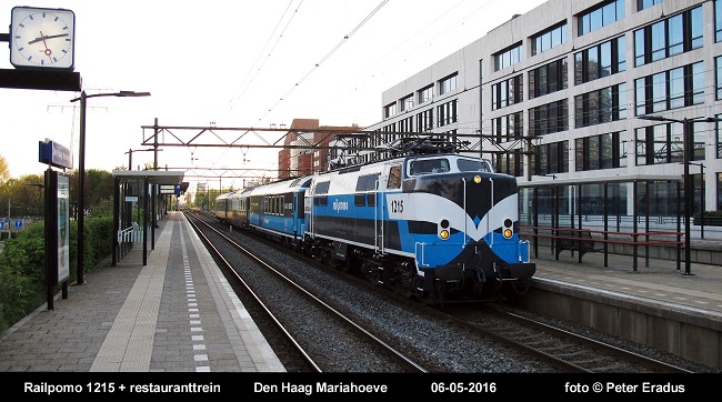 Met een kleine vertraging van ongeveer 15 minuten komt Railpromo 1215 met restauranttrein met een flinke snelheid door station Den Haag Mariahoeve op weg van Den Haag HS naar Amsterdam Centraal. Met die drie wagens aan de trekhaak had de lok duidelijk geen moeite ;)
