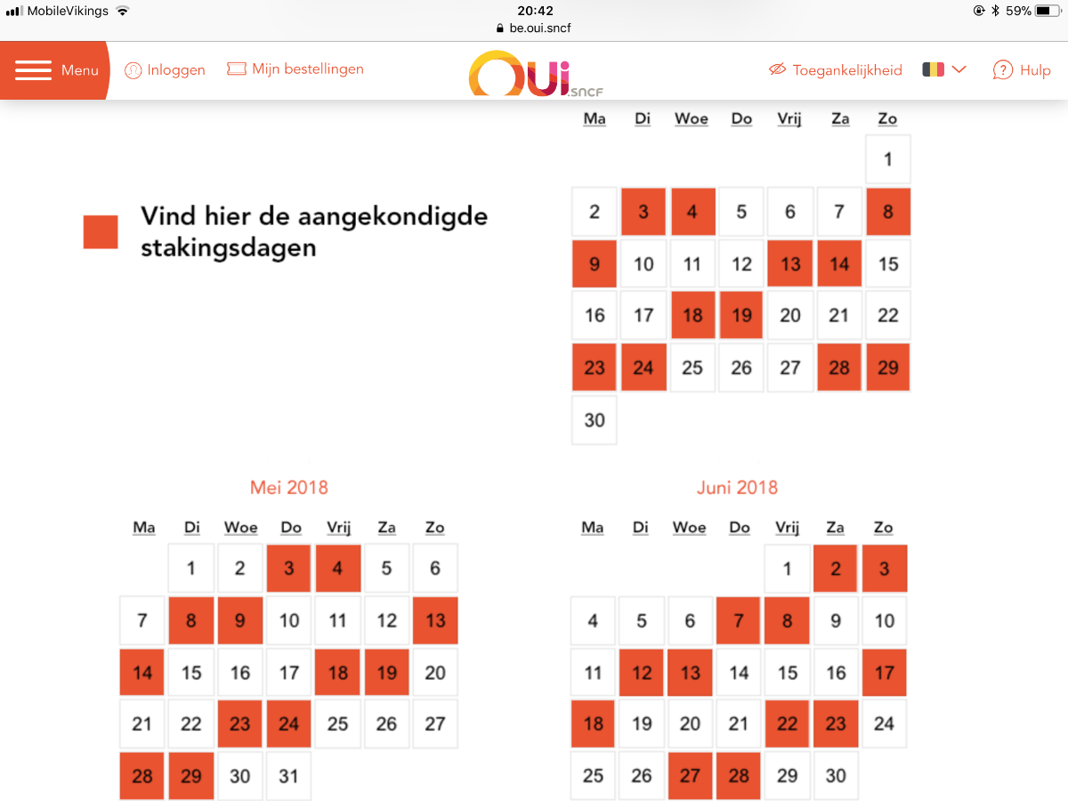 Bij de SNCF zelf kan ik vrij weinig info vinden over de staking 2 van de 5 dagen. Kan je treinreizen alsnog langer op voorhand plannen, is bekend welke dagen er gestaakt zal worden? Planner lijkt niet echt bruikbaar, zoek je een dag op in mei 'Attention, contrairement à ce qui est indiqué ci-dessous, votre train circule la totalité de son parcours. Ce message est valable uniquement pour le 04/04/2018.' Bijna NMBS-iaans waar overal een uitroepteken staat.