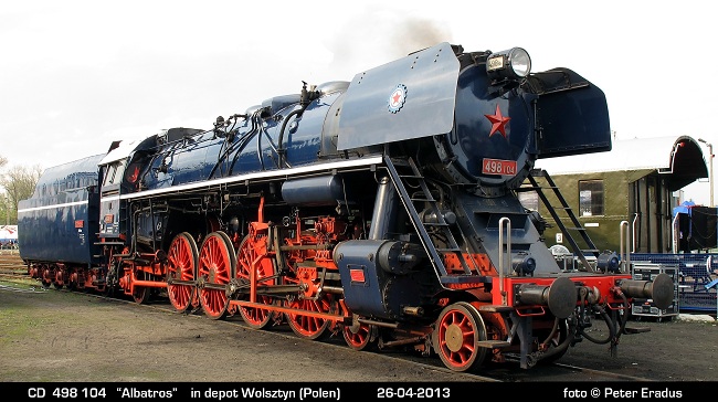 Speciaal voor de stoomlokparade te Wolsztyn op zaterdag 27 april 2013 was de 498 104, onderdeel van de Slowaakse Nationale Collectie, vanuit Bratislava overgekomen. Op de foto deze fraaie en imposante machine in het depot van Wosztyn, Polen