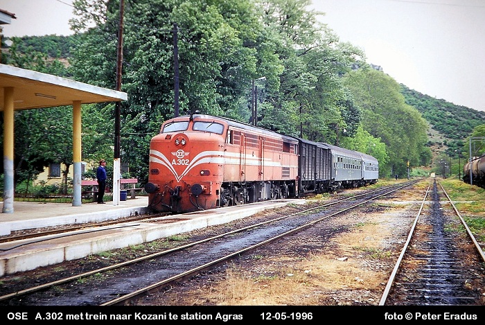 Een toch wel interressante lok op deze opname, lok A302 (Alco DL500C), een enorme 6-asser uit 1962, welke toen nog als enige van haar serie vanuit het depot in Thessaloniki werd ingezet. Hier de lok met lokaaltrein in het station van Plati. Aan het einde van de rit moest de lok altijd gekeerd worden, had immers maar aan één zijde een echte cabine. Aan de andere kant zat slechts een hulpstuurstand.
