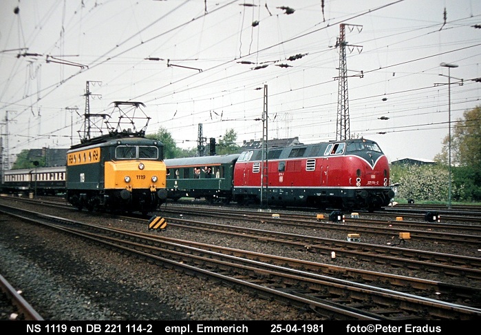 In 1981 waren er tussen Emmerich en Arnhem ritten met de oude Rheingold rijtuigen. Op de foto komt DB lok 221 114-2 met deze trein binnenrijden te Emmerich, terwijl NS lok 1119 staat te wachten voor haar volgende inzet voor een "Buurlandtrein" richting Nederland.