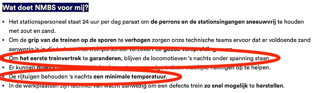 NMBS lijkt nochtans te zeggen dat de treinen onder spanning blijven en op minimumtemperatuur.nighttrain schreef: ↑19 jan 2024, 20:57 en later eventueel ijzel gaat worden door de sterk verlaging van de omgevingstemeratuur (Bv gedurende de nacht).