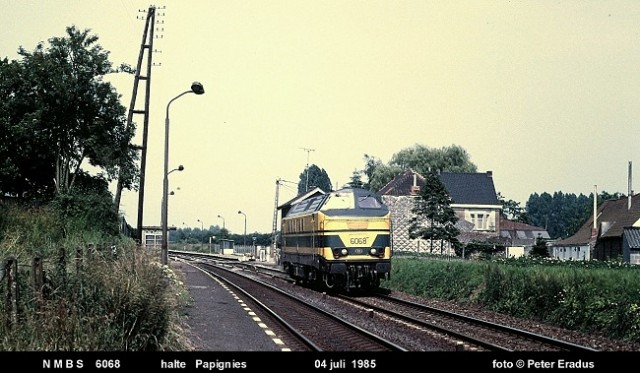 Halte Papignies ligt tussen Aat en Geraardsbergen en dit traject werd in 1988 voorzien van bovenleiding, dus ik was toen nog net op tijd om de oude sfeer op de dia vast te leggen.