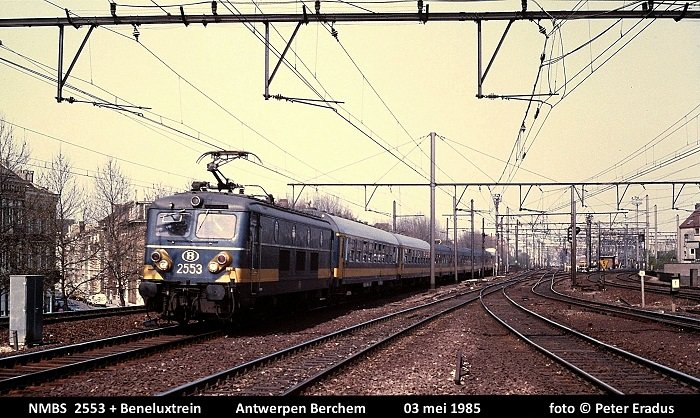 Een klassieke Beneluxtrein onderweg van Amsterdam naar Brussel Zuid komt hier het station van Antwerpen Berchem binnenrijden.