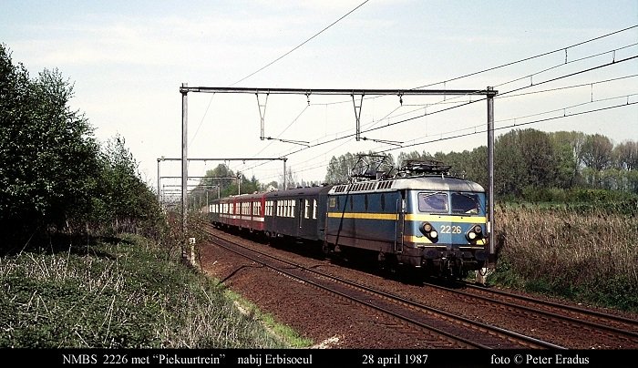 Op 28 april 1987 naderde locomotief NMBS 2226 met vier rijtuigen Type M2 de halte van Erbisoeul, als Piekuurtrein naar Bergen / Mons.