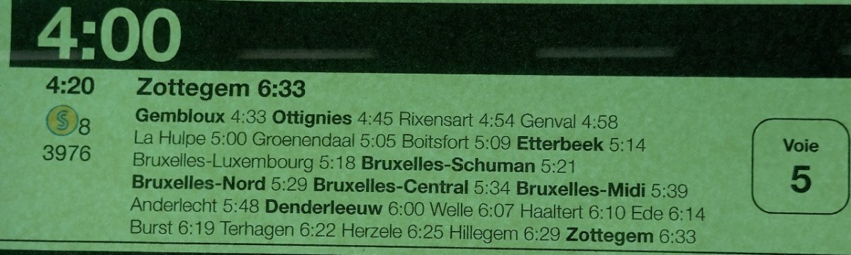Allebei de eerste S8 39XX treinen zijn de speciale gevallen. De 3955 vertrekt vanuit Oudenaarde. En tijdens de ochtendspits zijn er een paar richting Louvian-La-Neuve die de haltes Hillegem en Welle niet bedienen. Normaal zouden 2 P-treinen (P7953 en P7955) die haltes dan bedienen, maar die zijn bij weten nooit uitgereden. Onder andere door corona zijn die 2 treinen verdwenen en ze komen niet meer in dienst denk ik. Omgekeerd geldt dat voor treinen 8952 en 8954.