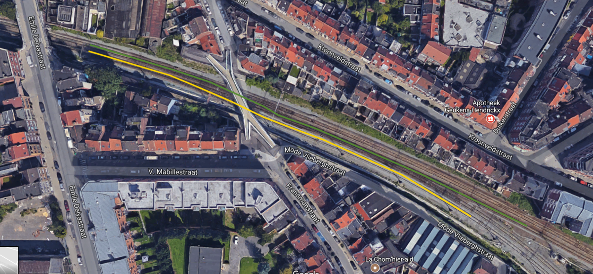 Een leuke variant was deze: vertrek uit Bockstael op spoor 2 (richting Jette), volop aanzetten, terwijl er net voorbij het station vanaf lijn 28 ook een trein op snelheid aankomt en dus pal naast je rijdt, waar er even drie sporen liggen (Y Bockstael). Het doet echter heel vies aan want je wéét dat dat derde spoor 100 meter verderop verdwijnt terwijl beide treinen volop blijven doorrijden... maar mijn trein uit Bockstael wordt op dat punt (gelukkig) op tegenspoor geleid via de wissel terwijl de trein vanaf lijn 28 dan op het spoor geleid wordt waar mijn trein tot dat punt reed. Op die manier rijden beide dan parallel verder tot station Jette.