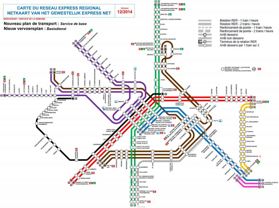 - Dit is iets wat volgens mij echt beter kan: voor de beide verbindingen Nijvel - Antwerpen is er kennelijk een copy-paste gedaan van de huidige situatie, waardoor er heel wat gemiste kansen zijn. In stations als Vorst-Oost en Ukkel-Stalle zou bijvoorbeeld nog steeds slechts één trein per uur stoppen. Het potentieel is er nochtans: een Vorst-Oost ligt midden in het centrum van Vorst (en ook vlakbij Vorst-Nationaal), waar men schreeuwt om een efficiënte verbinding naar het centrum. De huidige vrij lage reizigersaantallen liggen volgens mij louter aan de magere bediening. Ook ietwat onlogisch is dat een van beide verbindingen nog steeds Schaarbeek zou overslaan - richting NZV zijn daar natuurlijk al genoeg andere verbindingen, maar richting Vilvoorde en Antwerpen blijft het zo maar beperkt tot één treintje per uur. Structureel gezien is het ook ietwat vreemd dat men nog steeds een omnibus in het zuiden koppelt aan een iets snellere trein in het noorden en vice versa.