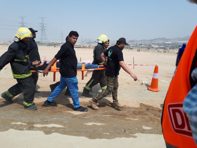 Deel 2 van de evacuatie oefening. Ontspoorde trein....U kan de tent zien waar de obeservators konden plaats nemen alsook het sorteer gebeuren van de gewonden. Alsook de lunch box op zijn Saudisch, 2 "croissants\\\\\\\\\\\\\\\\\\\\\\\\\\\' chocolade gebakje ,vruchten jus en water.