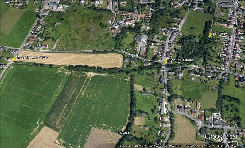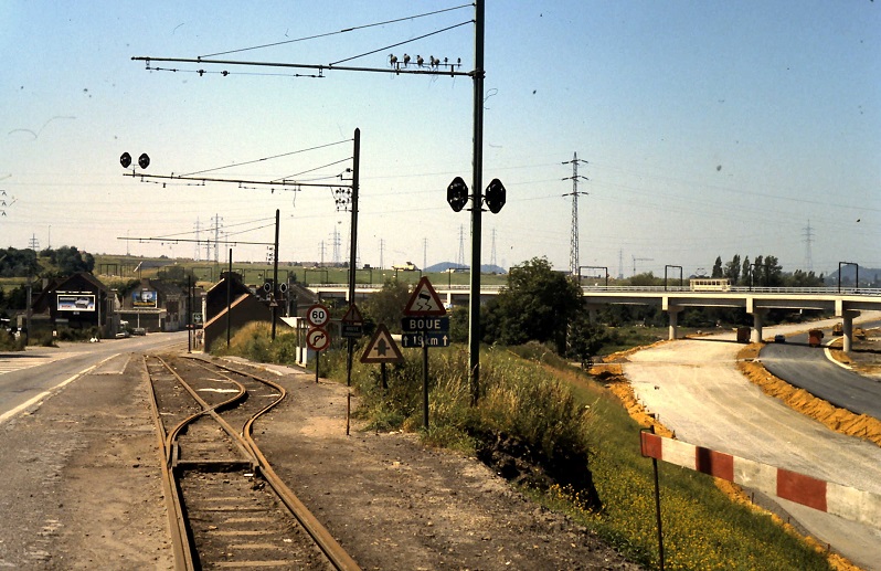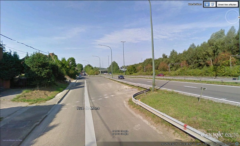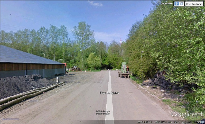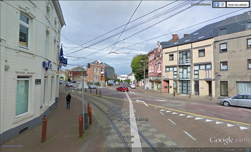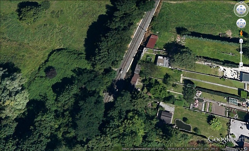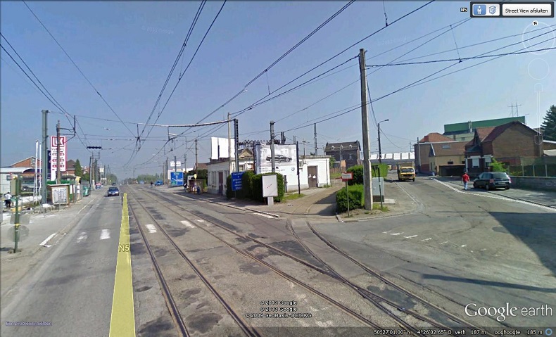 Nu we toch bezig zijn met wat jarenlang de laatste Boerentram van België was ( tot 1993) hier een paar interessante plaatjes van het traject vanuit Anderlues richting La Louviere. Eerst een luchtopname van de eindhalte Monument van lijn 89 (of, zo U wilt: 1). Rechts in de schaduw de terminus voor reizigers, midden onder de officiële Terminus. Op deze plaats wordt gezwaaid naar "de Wattman", vervolgens een luchtopname van "het juk dat aan alle illusies een einde maakte", gelegen zo'n 100 meter achter de officiële Terminus, waarna we het eerste deel van lijn 90 volgen tot de Rue Chateau d'Eau. Vandaar uit kromt het traject weer naar de Chaussee de Mons. Jarenlang hebben sporen en bovenleiding hier werkloos gelegen en werden geleidelijk door de natuur weer veroverd. De TEC te La Louviere weigerde ook maar iets met de tram van doen te hebben, en voelde zich dus ook niet geroepen buiten La Louviere "de rommel op te ruimen". Uiteindelijk is na jarenlang gerechtelijk getouwtrek in arren moede het Waals gewest zelf maar alles stukje bij beetje gaan verwijderen , waarna de kosten werden toegerekend aan La Louviere en de plaatselijke TEC- zo was er dus toch nog enigszins sprake van zoete wraak...