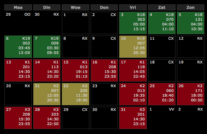 De kleuren geven enkel weer of het om een vroege (groen) dag (geel) of late(rood) dienst ging.