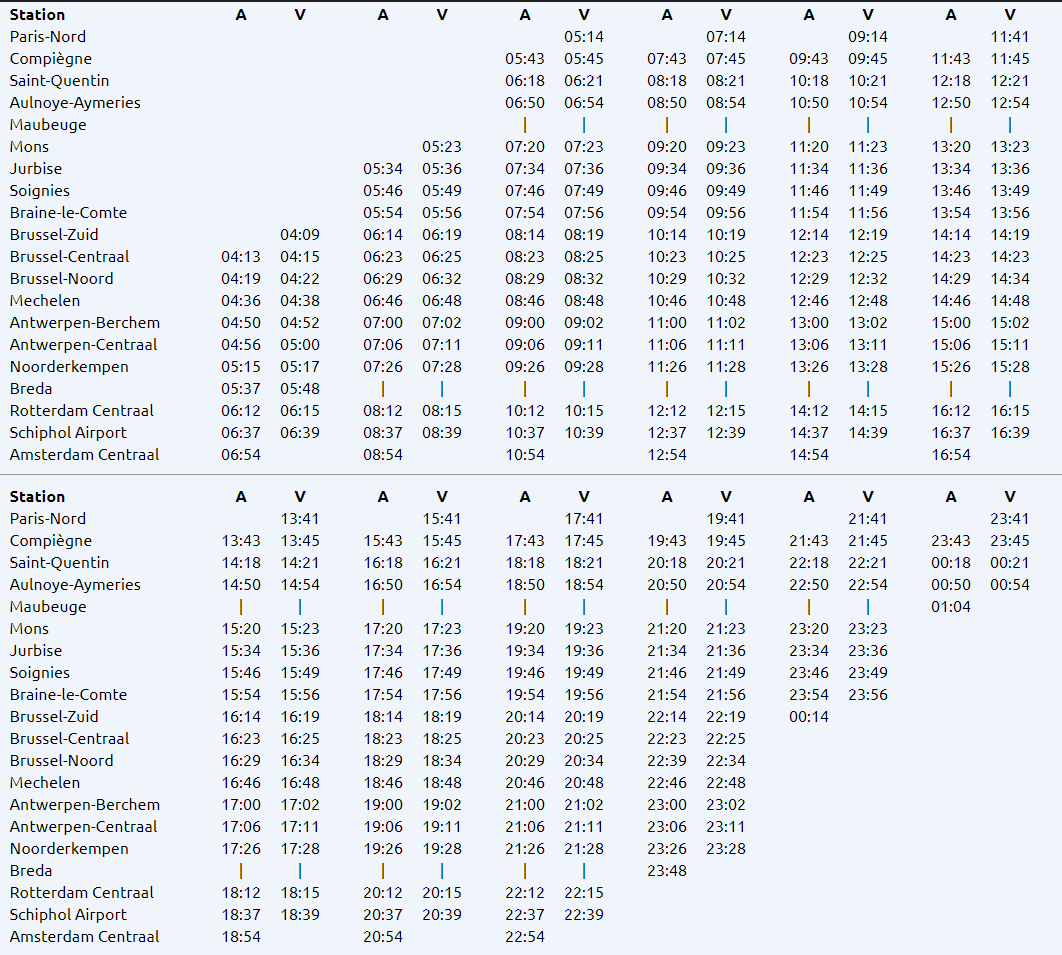 - EX-2: Amsterdam - Antwerpen - Brussel - Mons - Aulnoye-Aymeries - Paris (frequentie elke 2u)