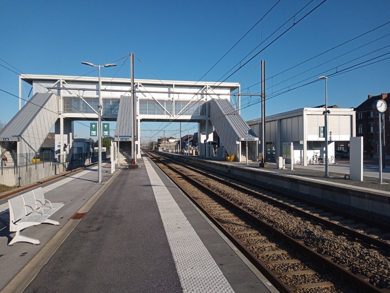 Het station Fleurus werd recent helemaal vernieuwd: hoge perrons, een wachtruimte aan de straatzijde, een ruim uitgemeten voetgangersbrug boven de sporen met liften en trappen, en aan de achterzijde, waar de TEC-bus naar de luchthaven vertrekt, een kleinere wachtruimte zonder zitgelegenheid en een afgesloten fietsenstalling. Alles uitgevoerd als een kille, strakke, grijze constructie in beton en staal, aangenaam is anders. Het ziet er allemaal heel clean uit, maar de vraag is voor hoelang, want er is geen toezicht, geen personeel aanwezig, niemand aan wie je info kunt vragen. Dat de bus naar de luchthaven aan de achterzijde van het station vertrekt (en dus niet van het ruime busstation aan de voorkant) moet je zelf ontdekken, er hangt wel hier en daar een bordje met een pijl, maar dat springt niet in het oog en is ook niet erg duidelijk.