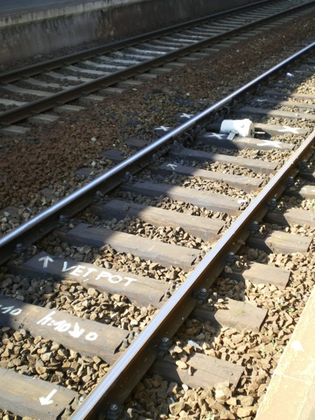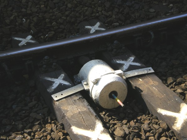 De laatste dagen zie ik wanneer ik de trein tussen Gent-Sint-Pieters en Gent-Brugge, t.h.v. de aftakking naar Antwerpen een soort gele bussen aan de rails liggen. Het zijn bussen/tonnen ter grootte van een emmer die met een verbinding vasthangen aan de rails.