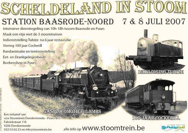 Tijdens het weekend van 7 en 8 juli organiseert vzw Stoomtrein Dendermonde-Puurs-BVS de eerste editie van Scheldeland in Stoom. Het evenement zal volledig in het teken staan van de 100ste verjaardag van de Cockerill, die sinds jaar en dag het werkpaard van de vereniging is.
