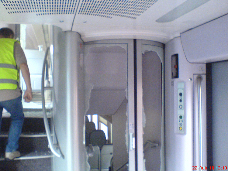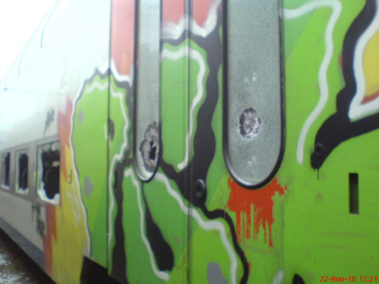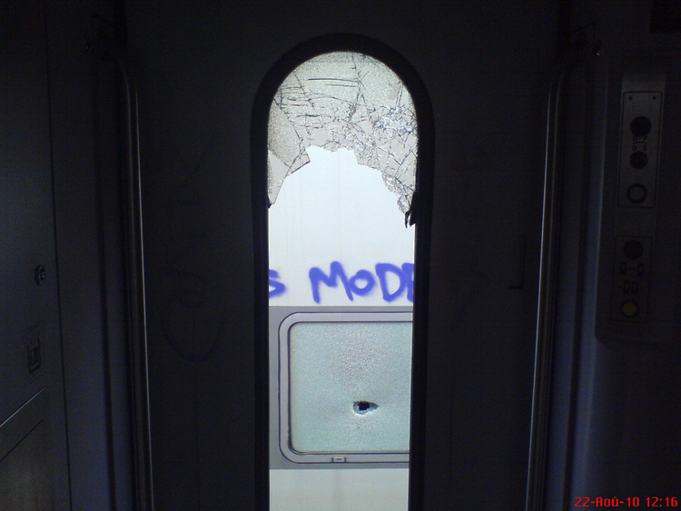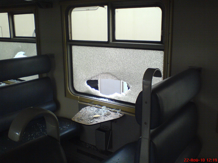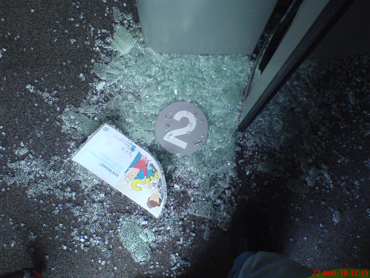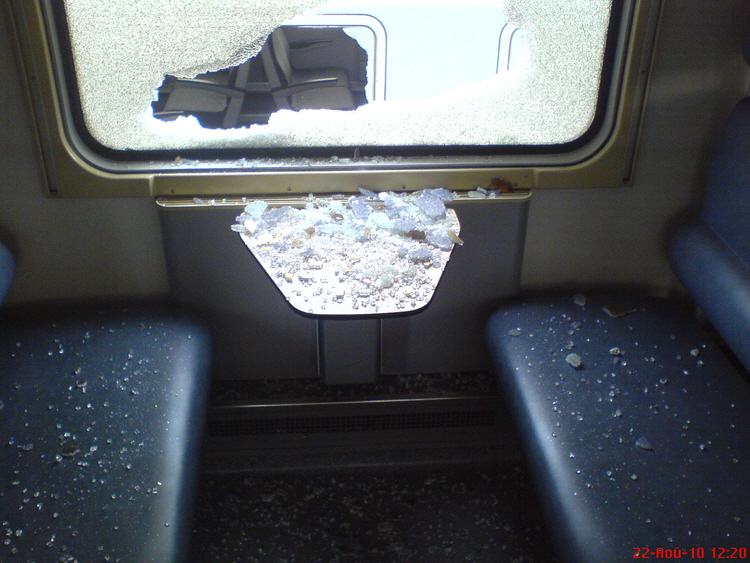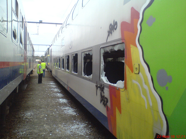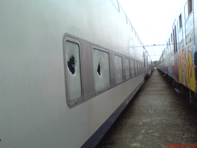 vandaag zag ik in het station Brussel-Noord een trein staan op spoor 10 waarvan de achterste 3 ruiten volledig verbrijzeld waren, maar er nog in bleven hangen. Ik hoorde nog iemand van de NMBS zeggen "vanbinnen ligt er niks" en even later vertrok de trein richting Antwerpen.