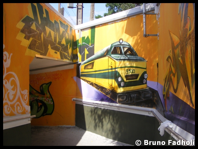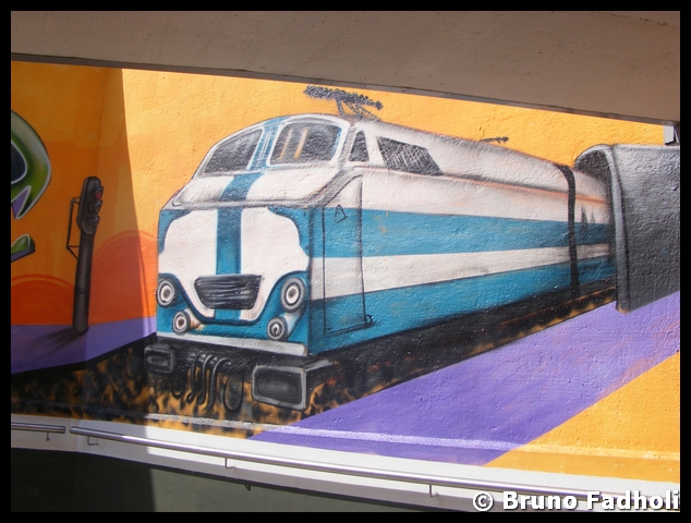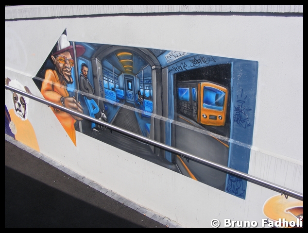 Inderdaad, in het station van Centenaire was er op de rolluik die de toegang tot dit station afsluit, ook een mooie graffiti-tekening van een metrostel te zien. Deze tekening bevindt zich weliswaar aan de binnenkant van het rolluik, dus niemand die er inderdaad van kan genieten (of last van hebben, voor de niet zo grote fans er van.
