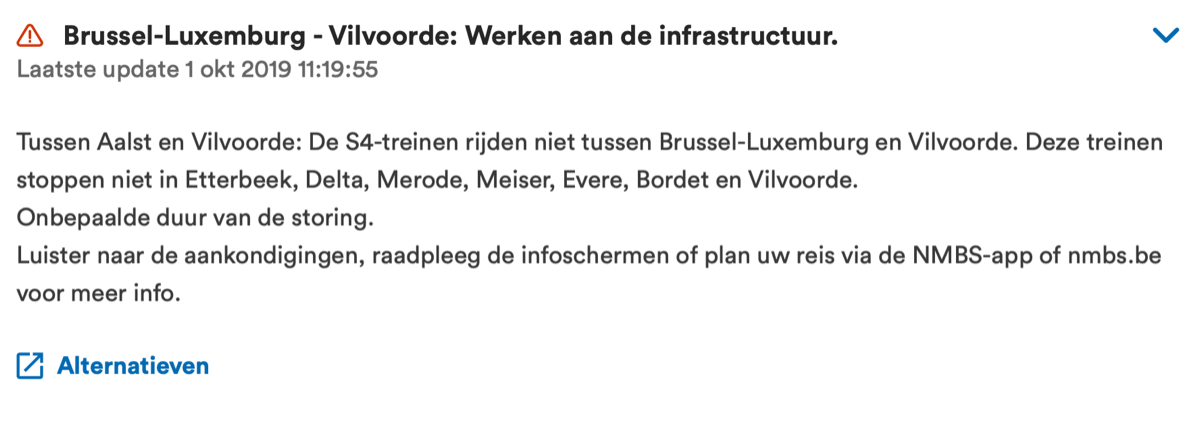 mervyn schreef: 01 okt 2019, 11:42 Iemand enig idee wat er aan de hand is tussen Vilvoorde en Brussel-Luxembourg? Afbeelding Is sinds gisterennamiddag. Volgens mij zijn dit geen geplande werken?