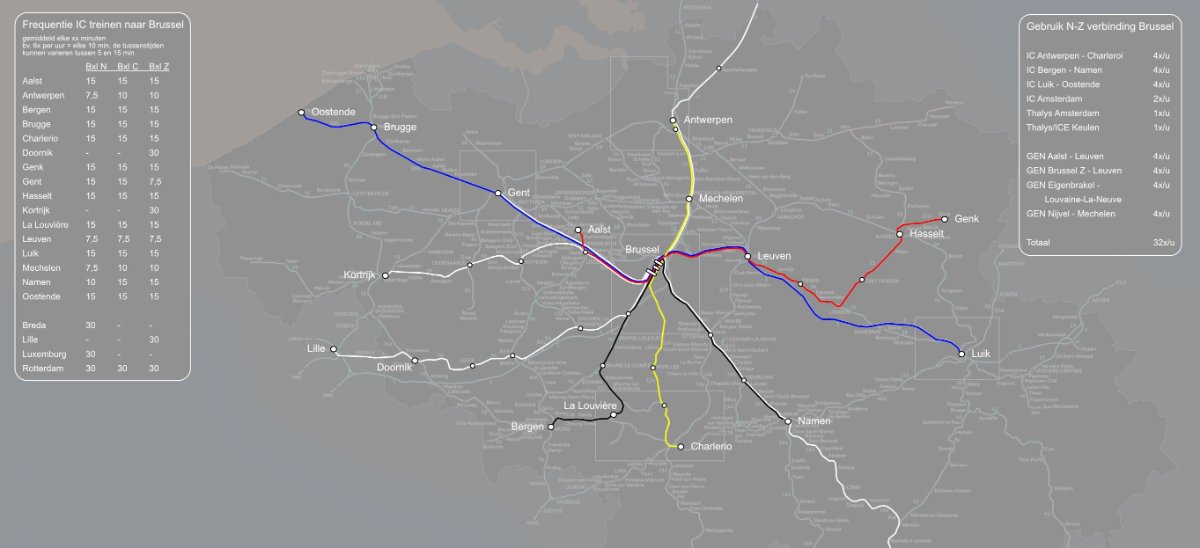Minder IC lijnen via de Noord-Zuid verbinding maar wel met een hoge frequentie (4x/u). In de huidige dienstregeling zijn er 18 verschillende IC lijnen + 7 GEN lijnen (Wiki N-Z Bxl).
