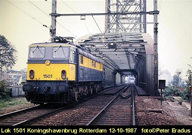 Ook na haar buitendienststelling in de zomer van 1986 reed de 1501 nog een aantal keren voordat ze gereviseerd en geschilderd zou worden. Op 10-10-1987 was er een "Open Dag" op het station van Rotterdam. Op 12-10-1987 bracht ik de lok weer terug naar R'dam Feijenoord en dit was een mooie gelegenheid om de lok eens nabij de Koningshavenbrug te fotograveren tijdens een korte fotostop aldaar (en voordat er reaktie's komen: er was ook nog een veiligheidsman aanwezig
