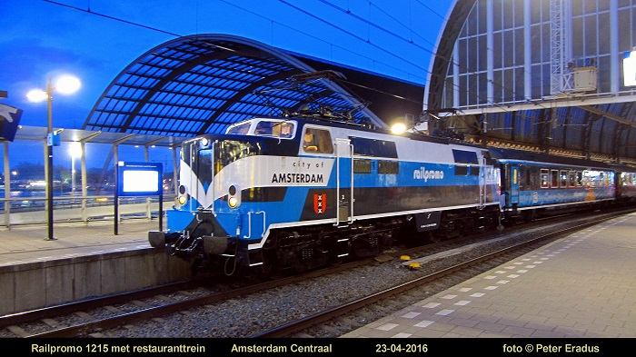 Op zaterdagavond 23 april 2016 ben ik even bij de Railpromo 1215 wezen kijken. Op de foto, genomen rond 21.00 uur, is de restauranttrein van Railpromo net weer aangekomen te Amsterdam C. na een "rondje Randstad".