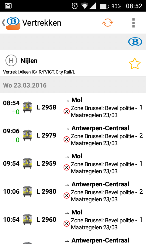 Stuur dat via Facebook of Twitter naar de NMBS. Daar reageren ze behoorlijk snel, ook met aanpassen van incorrecte informatie.Papanero schreef:We zijn intussen twee en een halve week na de aanslagen, en nog steeds blijft de NMBS-app totaal achterhaalde info geven. Bijvoorbeeld voor een traject van Schuman naar Thurn & Taxis wordt nog steeds verwezen naar een combinatie van metrolijn 1/5 met metrolijn 6 en station Pannenhuis, terwijl dat station al twee en een halve week dicht is. Ook voor diverse verbindingen binnen Brussel om 20 of 21 uur wordt verwezen naar de metro, terwijl de metro vanaf 19u volledig stil ligt....