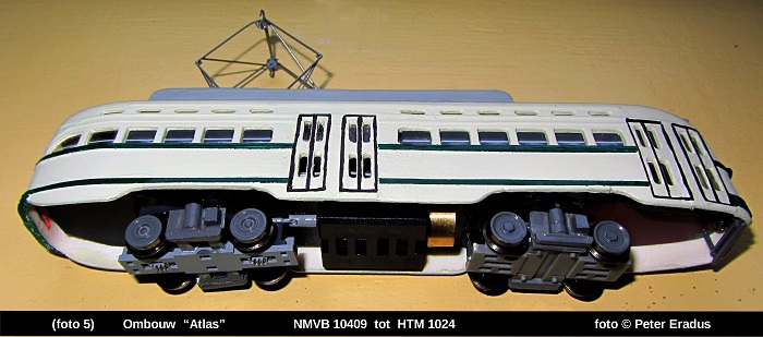 Op foto 1 is de zaag erin gezet en is er geen weg meer terug. Omdat de HTM 1024 korter is dan de NMVB wagen moet er één raam verwijderd worden om de juiste indeling te krijgen. Het beste gaat dit door op deze wijze te doen waarbij opgelet moet worden dat het raam uiteindelijk dezelfde grote weer krijgt, anders gaat het glas er niet meer in. Tevens worden de deuren uitgezaagd, en kleine stukjes van de bak, voldoende om de deuren iets te kunnen opschuiven