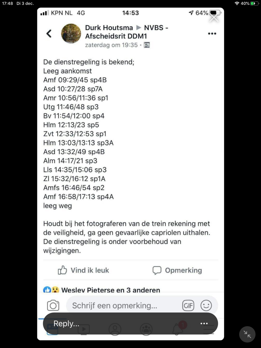 Hallo, hierbij een nieuwsbericht voor de geïnteresseerden in het Nederlandse spoorwegmaterieel. Op zondag 15 december zal er een afscheidsrit worden gehouden met het DDM-1 materieel (lijkt ook op DD-AR), deze zal rond 9:45 starten in Amersfoort en gaat daarna naar Zandvoort via Amsterdam. Mochten er nog vragen zijn, stel ze dan! Ik kan niet garanderen dat ik op alles antwoord weet :wink: