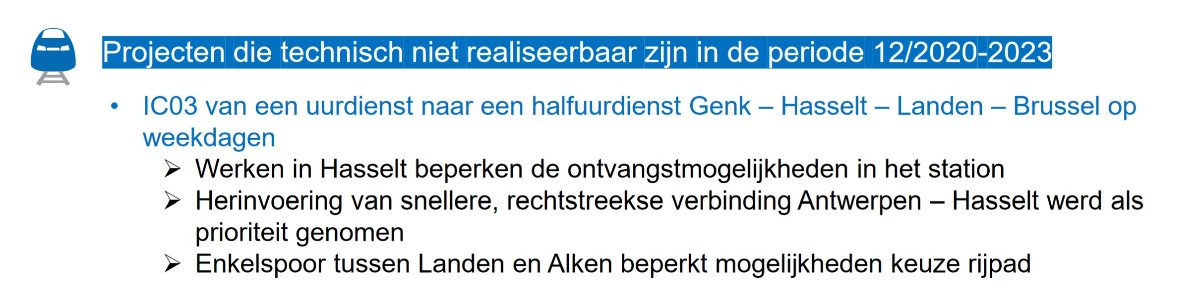 Ik vind echter de argumenten waarom dit niet mogelijk is namelijk "Ontvangst in Hasselt" en "Enkelspoor tussen Alken en Landen" nogal vreemd omdat er 's ochtends nu reeds een halfuurdienst met P-treinen gerealiseerd wordt op deze verbinding (zie ook hieronder). Ik begrijp dat deze elementen een robuuste halfuurdienst moeilijker maken maar "technisch niet realiseerbaar" gaat er bij mij toch niet helemaal in.