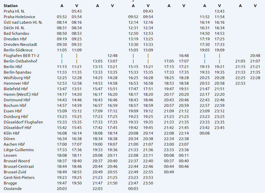 De stations in Berlin en Dresden heb ik ook gewoon overgenomen van de huidige EuroCity-treinen tussen Hamburg en Praha, zodat mijn treinen van Berlin eventueel zouden kunnen verder rijden als EuroCity met České dráhy-personeel.