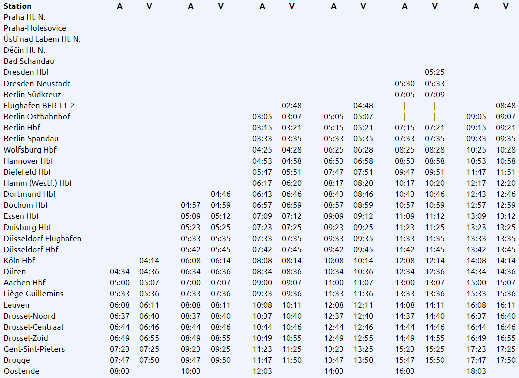 Ook gaan er meer ritten richting Praha, ong. elke 4u naar beide bestemmingen (Flughafen BER en Praha Hl. N.)